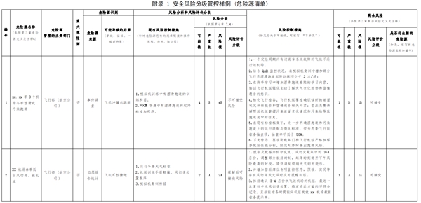 注2:民航風險分級沿用國際民用航空組織分級標準,通常為三個等級,與國家安全生產領域“紅橙黃藍”四個風險等級對應關系為:民航的不可接受風險對應國家安全生產領域的重大風險(紅)和較大風險(橙);民航的緩解后可接受風險對應國家安全生產領域的一般風險(黃);民航的可接受風險對應國家安全生產領域的低風險(藍)。