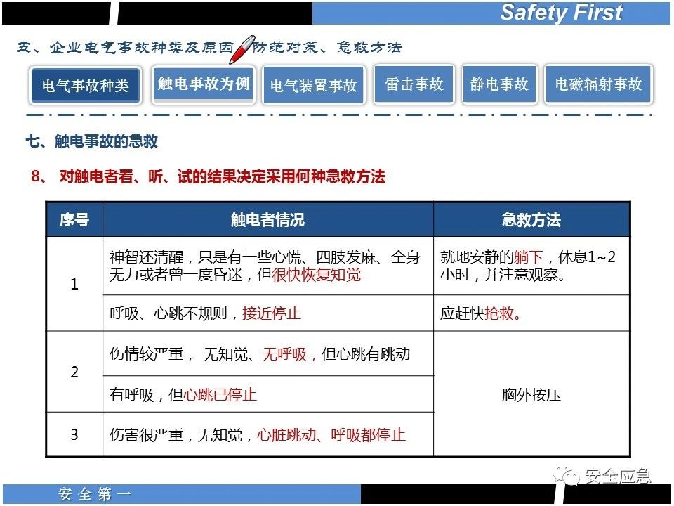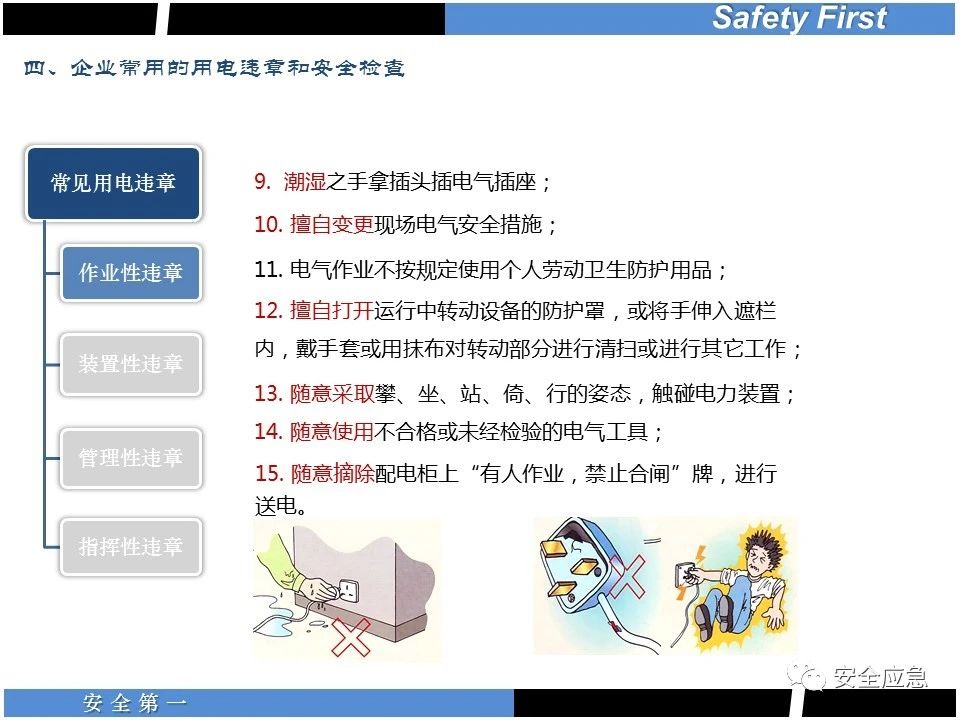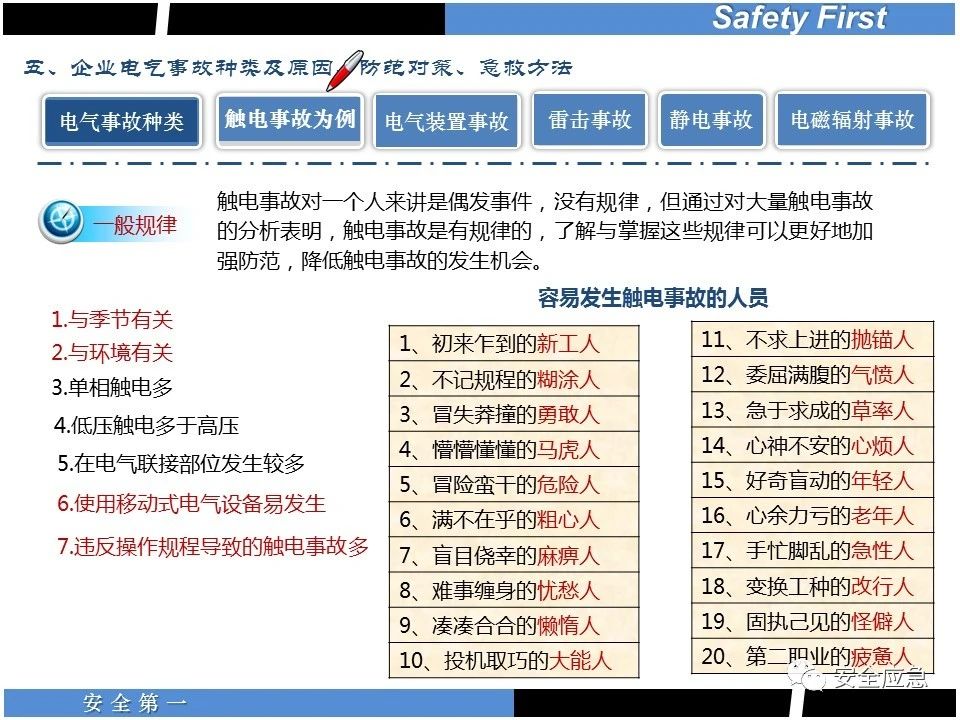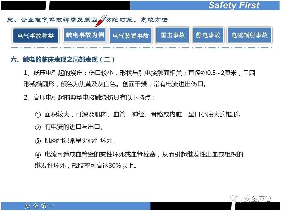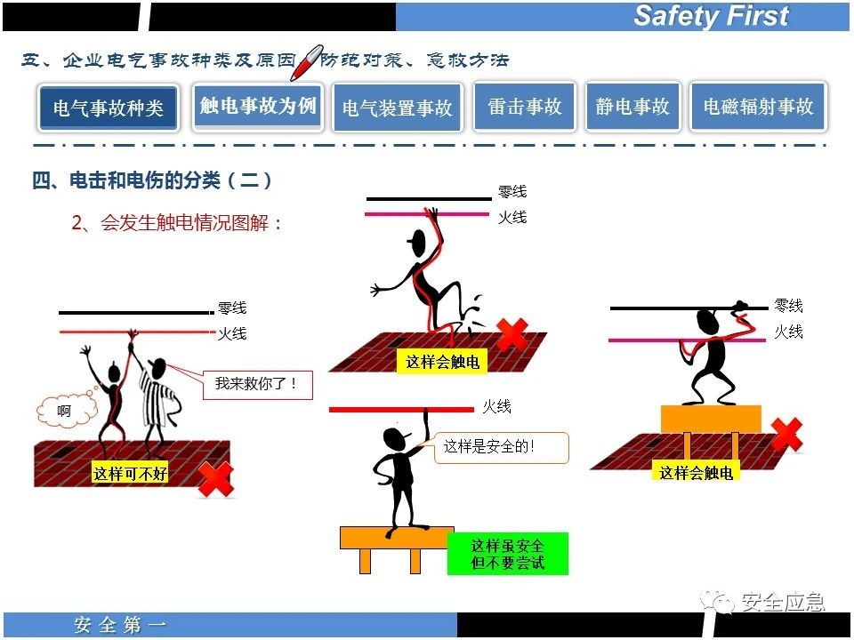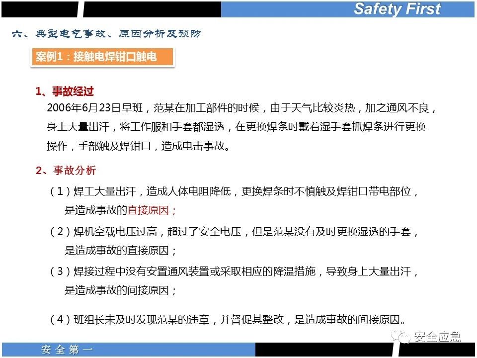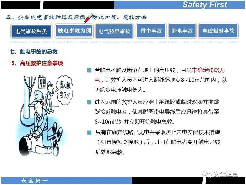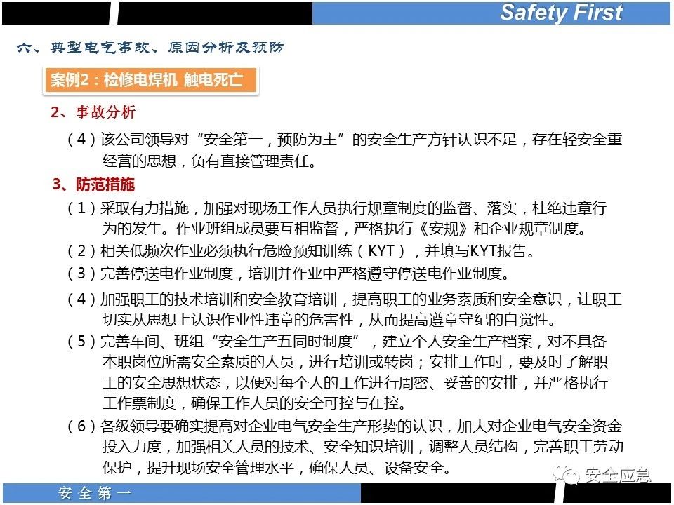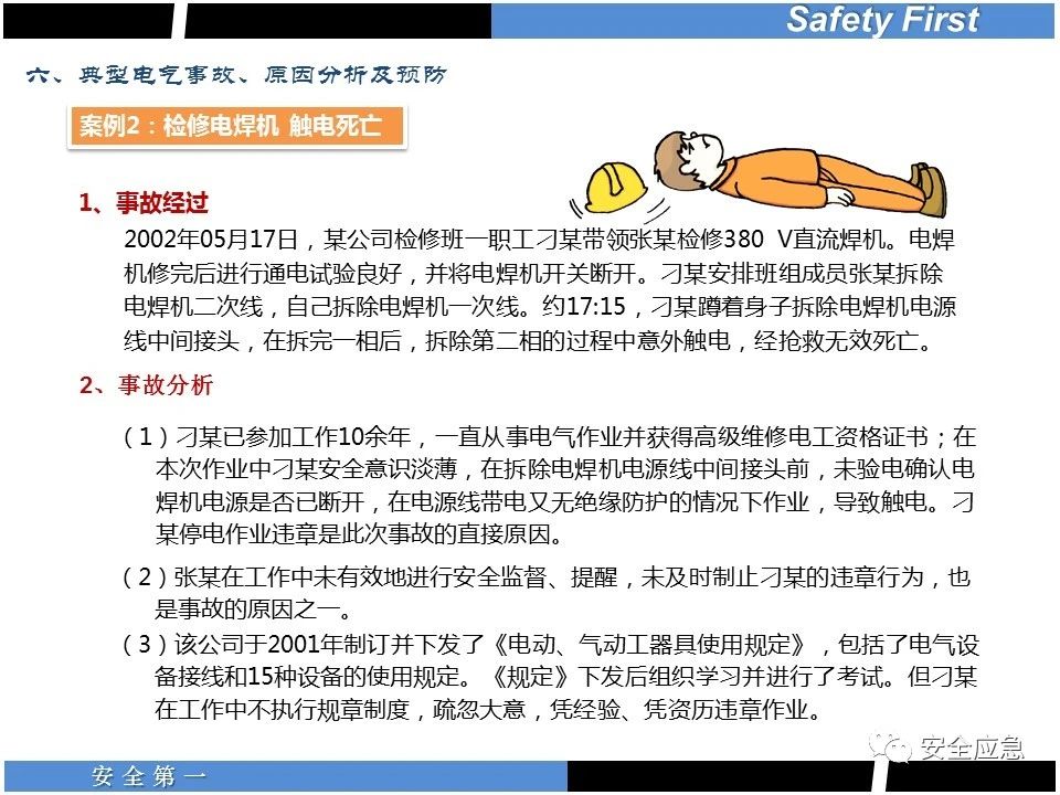 案例73 事故案例73:某35變電站準(zhǔn)備10kV避雷器試驗(yàn)。作業(yè)人員會(huì)同運(yùn)行人員準(zhǔn)備查看設(shè)備實(shí)際情況,拆卸10kV開(kāi)關(guān)柜背板螺栓,打開(kāi)了柜門上的電磁鎖,并打開(kāi)了后柜門后,作業(yè)人員探頭進(jìn)入開(kāi)關(guān)柜內(nèi)時(shí),對(duì)開(kāi)關(guān)柜放電。 其它案例見(jiàn)17、18、19、20、21、22、23、50、52。 (27)多組人員組織混亂 案例74 事故案例74:某單位開(kāi)展500kV線路停電檢修和地線融冰試驗(yàn)。1名工作人員不聽(tīng)他人勸阻,登塔拆除引流線。隨后開(kāi)展地線融冰試驗(yàn),該工作人員觸電死亡。 其它案例見(jiàn)45、46、47、48。 (28)交底不認(rèn)真 案例75 事故案例75:某工作負(fù)責(zé)人帶領(lǐng)兩名工作人員準(zhǔn)備在10kV線路裝設(shè)接地線。工作前,工作負(fù)責(zé)人沒(méi)有進(jìn)行班前(后)會(huì),沒(méi)有分配工作任務(wù),也沒(méi)有交代安全注意事項(xiàng),另外兩人也沒(méi)有主動(dòng)詢問(wèn),相互提醒,導(dǎo)致工作負(fù)責(zé)人無(wú)監(jiān)護(hù)誤登運(yùn)行線路,造成觸電。 其它案例見(jiàn)32。 (29)監(jiān)護(hù)不到位 l 單人工作無(wú)監(jiān)護(hù) 事故案例:36。 l 監(jiān)護(hù)人參與工作 事故案例:11。 l 監(jiān)護(hù)不認(rèn)真,或默許違章行為 事故案例:67。 (30)人員、工作安排不恰當(dāng) 案例76 事故案例76:某供電所安排不具備單獨(dú)工作資格和能力的新入廠員工上桿進(jìn)行配變?cè)O(shè)備搶修工作,由于安全距離不夠,員工經(jīng)驗(yàn)不足,監(jiān)護(hù)不到位,導(dǎo)致觸電。 案例77 事故案例77:某高壓試驗(yàn)班開(kāi)展定檢預(yù)試作業(yè)。工作負(fù)責(zé)人與工作人員在抄錄放電計(jì)數(shù)器銘牌,另一名剛參加工作不久的工作人員拿著自制試驗(yàn)線插入移動(dòng)電源盤插座內(nèi),然后,用左、右手分別拿住兩個(gè)鱷魚夾準(zhǔn)備對(duì)放電器搭接做試驗(yàn),左、右手習(xí)慣性的分別握住了兩個(gè)鱷魚夾的導(dǎo)體部分,此時(shí)電流通過(guò)人體,漏電保護(hù)器沒(méi)有動(dòng)作,觸電死亡。 (31)單人作業(yè) l 野外單人巡線、勘察 案例78 事故案例78:某單位開(kāi)展線路巡視時(shí),單人作業(yè),在被告知“巡視完N58塔后切勿過(guò)江,要沿原路返回”的情況下,仍然獨(dú)自一人違規(guī)游泳過(guò)江,溺水身亡。 案例79 事故案例79:某單位野外勘察時(shí),某工作人員在未告知工作負(fù)責(zé)人的情況下,獨(dú)自一人返回車輛所在地,途中墜落懸崖暈倒,受輕傷并失蹤12小時(shí)。 附件:最全面的電氣安全培訓(xùn),實(shí)用!