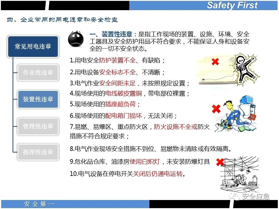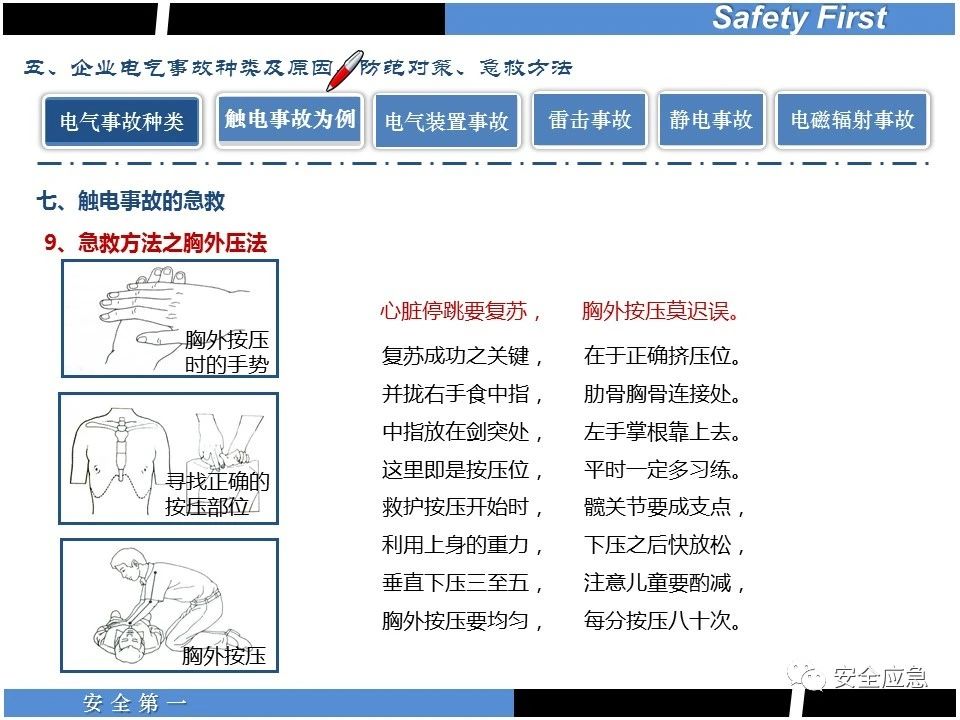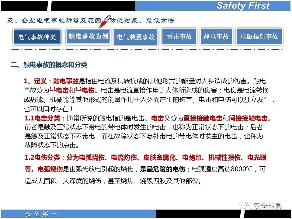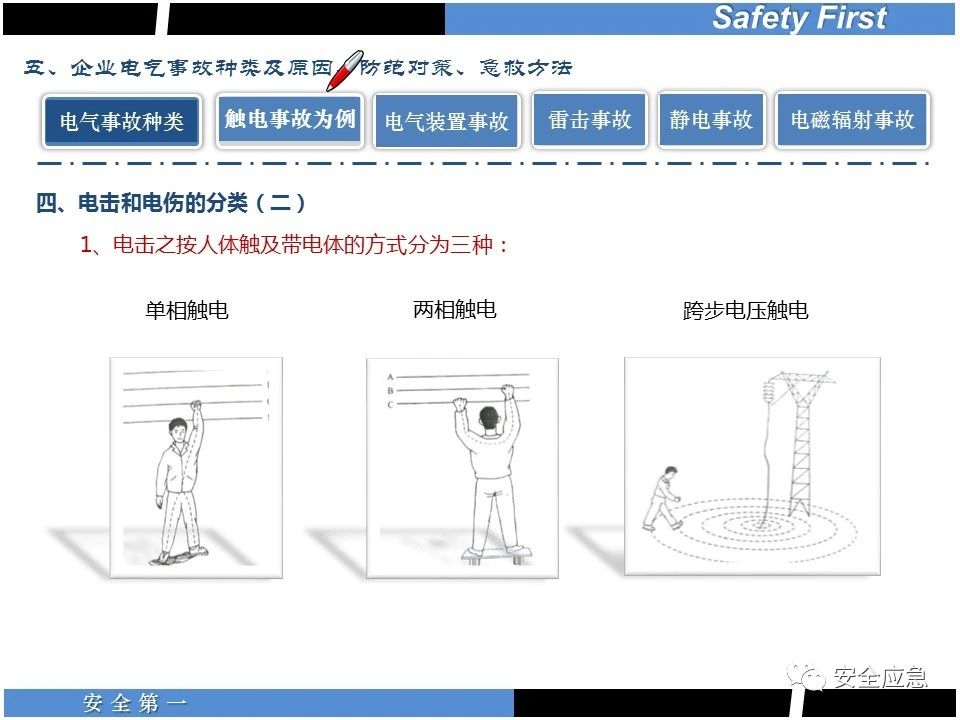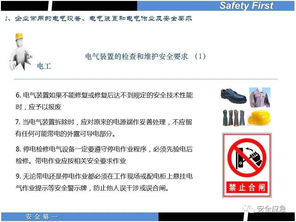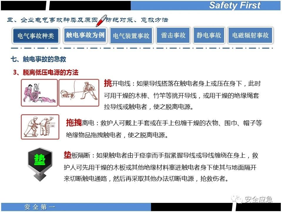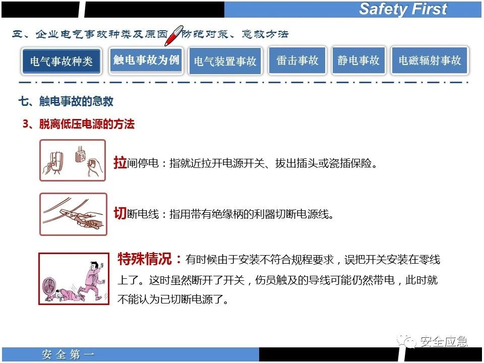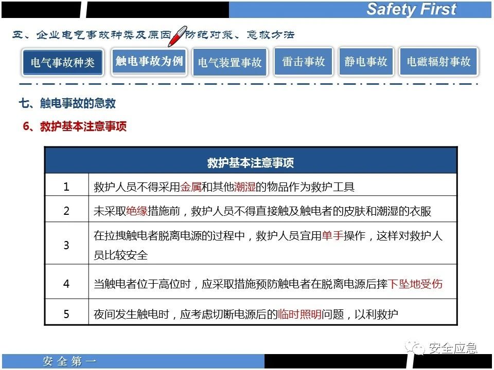 案例73 事故案例73:某35變電站準(zhǔn)備10kV避雷器試驗(yàn)。作業(yè)人員會(huì)同運(yùn)行人員準(zhǔn)備查看設(shè)備實(shí)際情況,拆卸10kV開(kāi)關(guān)柜背板螺栓,打開(kāi)了柜門上的電磁鎖,并打開(kāi)了后柜門后,作業(yè)人員探頭進(jìn)入開(kāi)關(guān)柜內(nèi)時(shí),對(duì)開(kāi)關(guān)柜放電。 其它案例見(jiàn)17、18、19、20、21、22、23、50、52。 (27)多組人員組織混亂 案例74 事故案例74:某單位開(kāi)展500kV線路停電檢修和地線融冰試驗(yàn)。1名工作人員不聽(tīng)他人勸阻,登塔拆除引流線。隨后開(kāi)展地線融冰試驗(yàn),該工作人員觸電死亡。 其它案例見(jiàn)45、46、47、48。 (28)交底不認(rèn)真 案例75 事故案例75:某工作負(fù)責(zé)人帶領(lǐng)兩名工作人員準(zhǔn)備在10kV線路裝設(shè)接地線。工作前,工作負(fù)責(zé)人沒(méi)有進(jìn)行班前(后)會(huì),沒(méi)有分配工作任務(wù),也沒(méi)有交代安全注意事項(xiàng),另外兩人也沒(méi)有主動(dòng)詢問(wèn),相互提醒,導(dǎo)致工作負(fù)責(zé)人無(wú)監(jiān)護(hù)誤登運(yùn)行線路,造成觸電。 其它案例見(jiàn)32。 (29)監(jiān)護(hù)不到位 l 單人工作無(wú)監(jiān)護(hù) 事故案例:36。 l 監(jiān)護(hù)人參與工作 事故案例:11。 l 監(jiān)護(hù)不認(rèn)真,或默許違章行為 事故案例:67。 (30)人員、工作安排不恰當(dāng) 案例76 事故案例76:某供電所安排不具備單獨(dú)工作資格和能力的新入廠員工上桿進(jìn)行配變?cè)O(shè)備搶修工作,由于安全距離不夠,員工經(jīng)驗(yàn)不足,監(jiān)護(hù)不到位,導(dǎo)致觸電。 案例77 事故案例77:某高壓試驗(yàn)班開(kāi)展定檢預(yù)試作業(yè)。工作負(fù)責(zé)人與工作人員在抄錄放電計(jì)數(shù)器銘牌,另一名剛參加工作不久的工作人員拿著自制試驗(yàn)線插入移動(dòng)電源盤插座內(nèi),然后,用左、右手分別拿住兩個(gè)鱷魚夾準(zhǔn)備對(duì)放電器搭接做試驗(yàn),左、右手習(xí)慣性的分別握住了兩個(gè)鱷魚夾的導(dǎo)體部分,此時(shí)電流通過(guò)人體,漏電保護(hù)器沒(méi)有動(dòng)作,觸電死亡。 (31)單人作業(yè) l 野外單人巡線、勘察 案例78 事故案例78:某單位開(kāi)展線路巡視時(shí),單人作業(yè),在被告知“巡視完N58塔后切勿過(guò)江,要沿原路返回”的情況下,仍然獨(dú)自一人違規(guī)游泳過(guò)江,溺水身亡。 案例79 事故案例79:某單位野外勘察時(shí),某工作人員在未告知工作負(fù)責(zé)人的情況下,獨(dú)自一人返回車輛所在地,途中墜落懸崖暈倒,受輕傷并失蹤12小時(shí)。 附件:最全面的電氣安全培訓(xùn),實(shí)用!