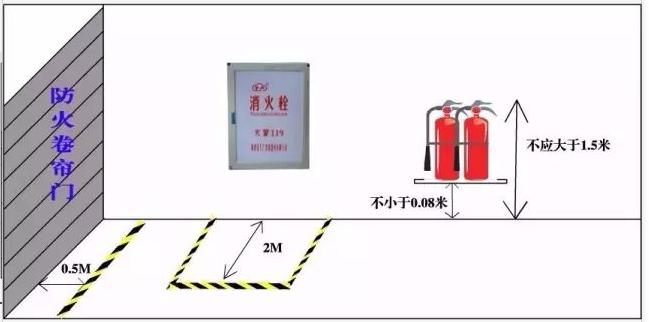 防火卷簾門兩側各0.5m范圍內不得堆放物品,并應用黃色標識線劃定范圍。《人員密集場所消防安全管理》(GA654-2006)8.3.7