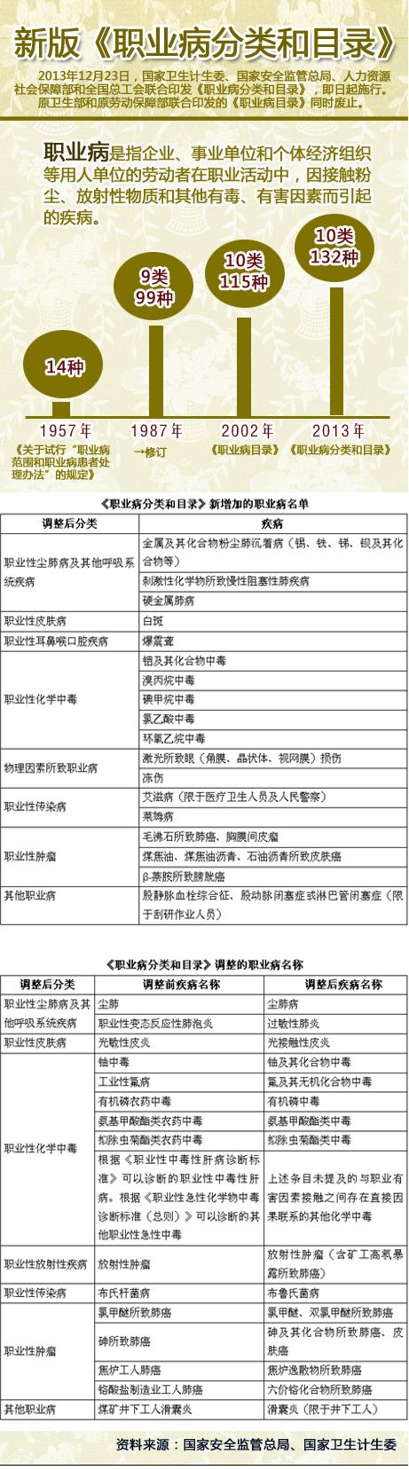 2013年12月23日,國家衛生計生委、國家安全監管總局、人力資源社會保障部和全國總工會聯合印發《職業病分類和目錄》,即日起施行。原衛生部和原勞動保障部聯合印發的《職業病目錄》同時廢止。