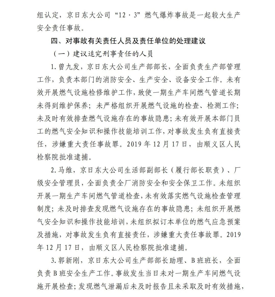 2.馬維,京日東大公司生活部副部長(履行部長職責)、廠級安全管理員,全面負責全廠消防安全和安全保衛工作。未組織開展一期生產車間燃氣管道檢查,未有效落實燃氣設施檢查管理制度;未及時排查發現燃氣設施存在的事故隱患;未組織開展燃氣安全知識和操作技能培訓,未組織擬訂本單位的燃氣應急預案及措施,對事故發生負有直接責任,涉嫌重大責任事故罪。2019 年 12 月 17 日,由順義區人民檢察院批準逮捕。