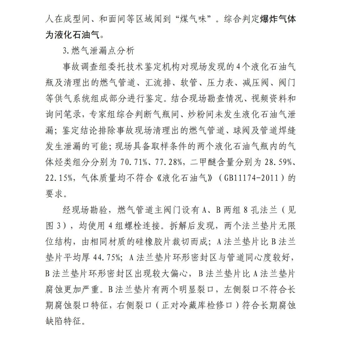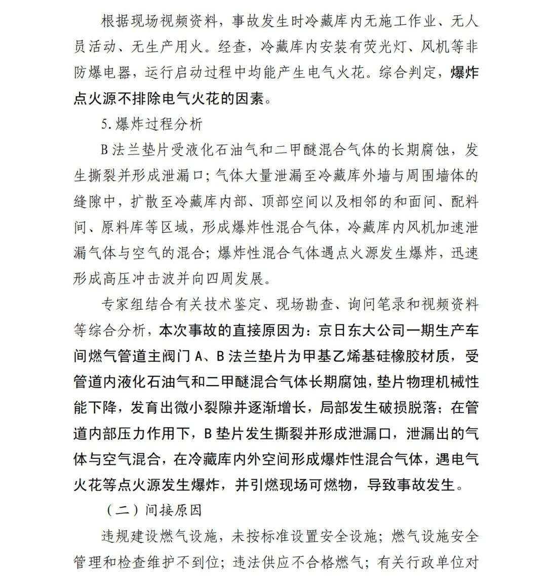 本次事故的直接原因為:京日東大公司一期生產車間燃氣管道主閥門A、B法蘭墊片為甲基乙烯基硅橡膠材質,受管道內液化石油氣和二甲醚混合氣體長期腐蝕,墊片物理機械性能下降,發育出微小裂隙并逐漸增長,局部發生破損脫落;在管道內部壓力作用下,B墊片發生撕裂并形成泄漏口,泄漏出的氣體與空氣混合,在冷藏庫內外空間形成爆炸性混合氣體,遇電氣火花等點火源發生爆炸,并引燃現場可燃物,導致事故發生。