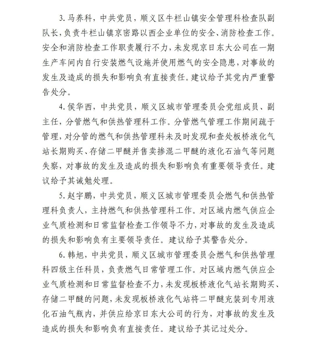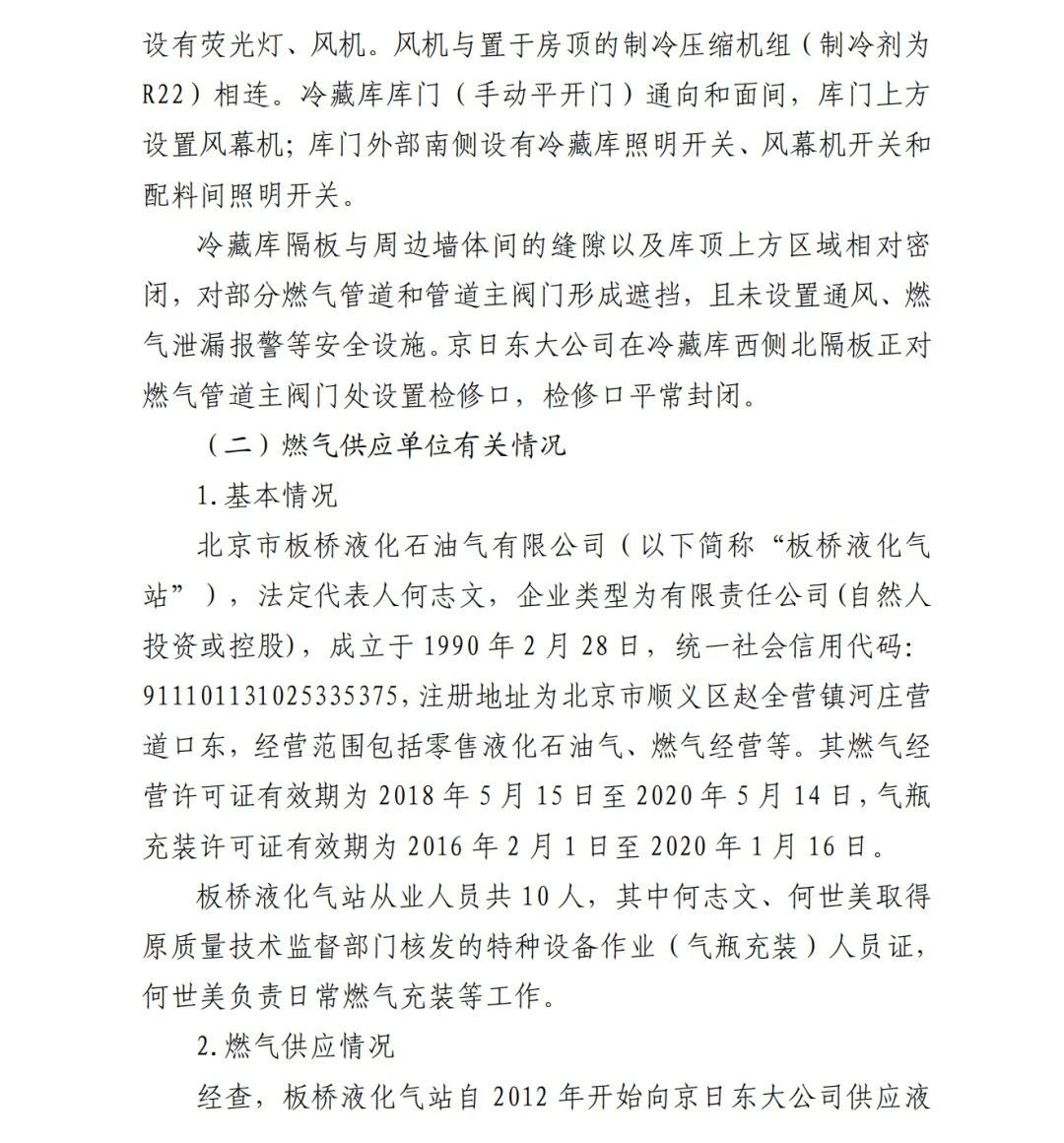 4.方勇忠,曾先后擔任京日東大公司生活部副部長兼設備部部長助理、設備部部長、生產部部長兼設備部部長、總經理助理(2019年4月辭職)。2006年負責京日東大公司一期生產車間建設工作,期間未委托具有相應資質的施工單位,組織本單位人員自行建設安裝燃氣設施,導致燃氣設施安全隱患長期存在;2018 年負責一期生產車間內新建冷藏庫建設,將部分管道、閥門等燃氣設施封閉在通風不良的場所內,且未設置通風、燃氣泄漏報警等安全設施,對事故發生負有直接責任,涉嫌重大責任事 故罪。2020 年 1 月 23 日被順義公安分局刑事拘留,2 月 6 日取 保候審,建議依法追究刑事責任。