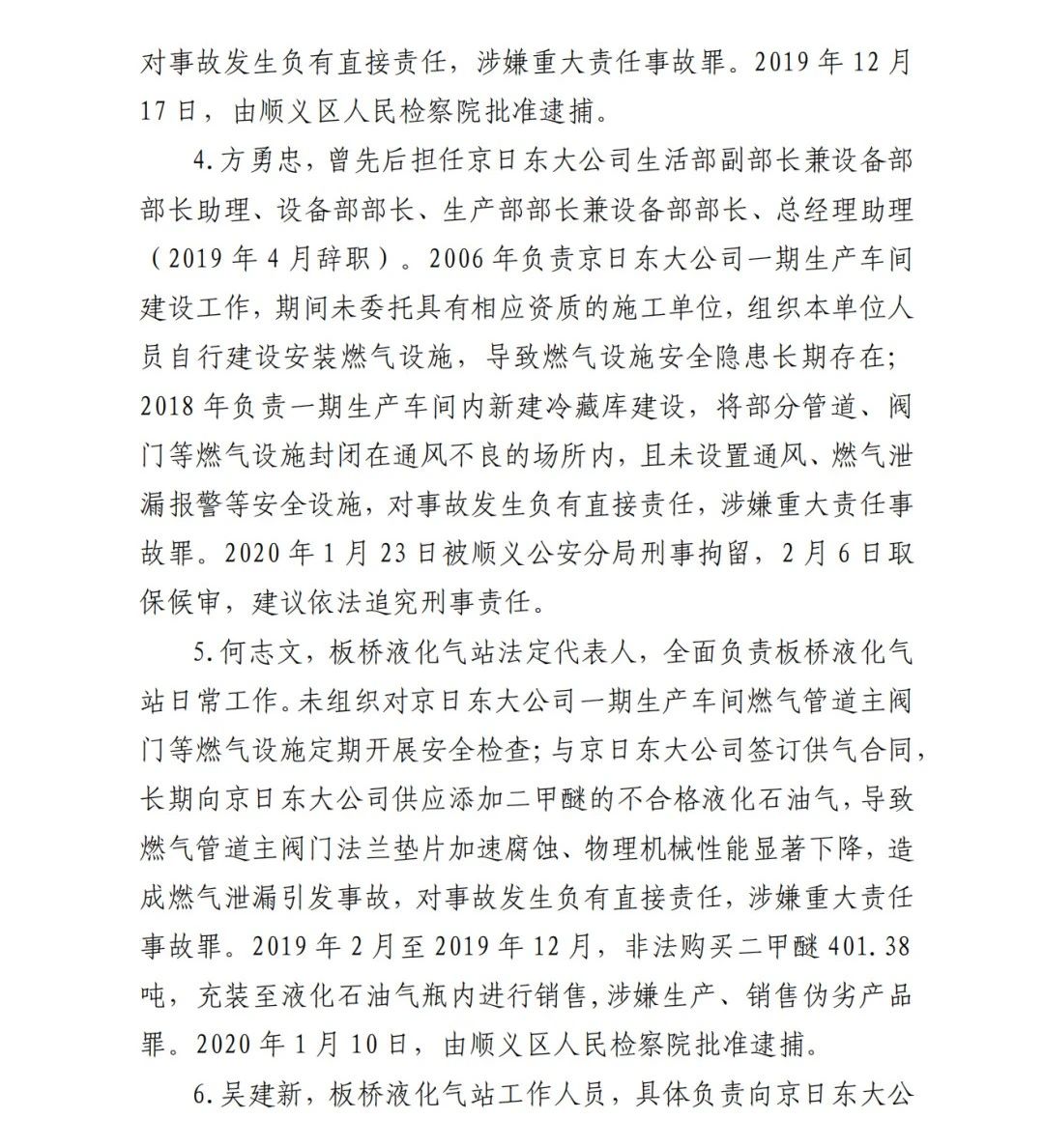 6.吳建新,板橋液化氣站工作人員,具體負責向京日東大公15司供應配送液化石油氣。未開展針對京日東大公司一期生產車間燃氣管道主閥門等燃氣設施的安全檢查;長期向京日東大公司供應、配送添加二甲醚的不合格液化石油氣,導致燃氣管道主閥門法蘭墊片加速腐蝕、物理機械性能顯著下降,造成燃氣泄漏引發 事故,對事故發生負有直接責任,涉嫌重大責任事故罪。2019 年 2 月至 2019 年 12 月,向京日東大公司銷售添加二甲醚的不合 格液化石油氣,銷售金額達 380349 元,涉嫌生產、銷售偽劣產品 罪。2020 年 1 月 10 日,由順義區人民檢察院批準逮捕。