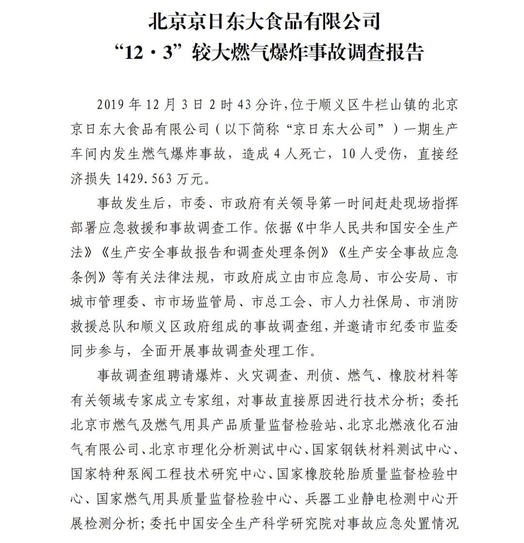 2019年12月3日2時43分許,北京順義區牛欄山鎮的(以下簡稱“京日東大公司”)一期生產車間內發生燃氣爆炸事故,造成4人死亡,10人受傷,直接經濟損失1429.563萬元。