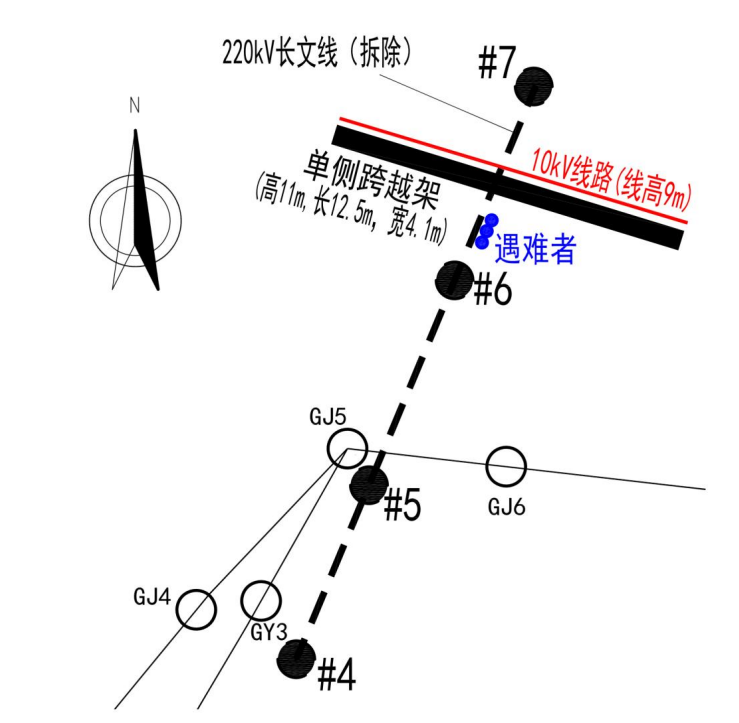 2023 年5月8日,施工項目部安排施工人員在原 220 千伏長文線 6-7 號桿塔間進行10千伏夏屯線跨越架搭設,因民事阻工僅在事故發生處南側搭設了單側跨越架。