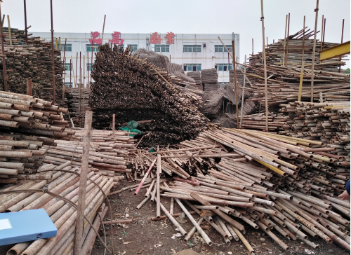 經(jīng)現(xiàn)場堪查,事故所在地現(xiàn)場堆放了大量鋼管及鋼笆片。鋼管堆垛支撐骨架由豎向三根鋼管(分左右兩側(cè)六根)、橫向三根鋼管組成,豎向鋼管與橫向鋼管通過扣件連接緊固,從而搭成一個支撐骨架。骨架搭建好后,便向上堆放散裝鋼管,每堆好一層鋼管(層高約75cm),便用橫向鋼管與豎向鋼管用扣件固定,共堆放6層,鋼管堆垛高約4.5m(0.75m×6層)。鋼笆片堆垛則較為凌亂,且部分鋼笆片未與鋼管堆垛分開堆放。堆垛現(xiàn)場見下圖一。