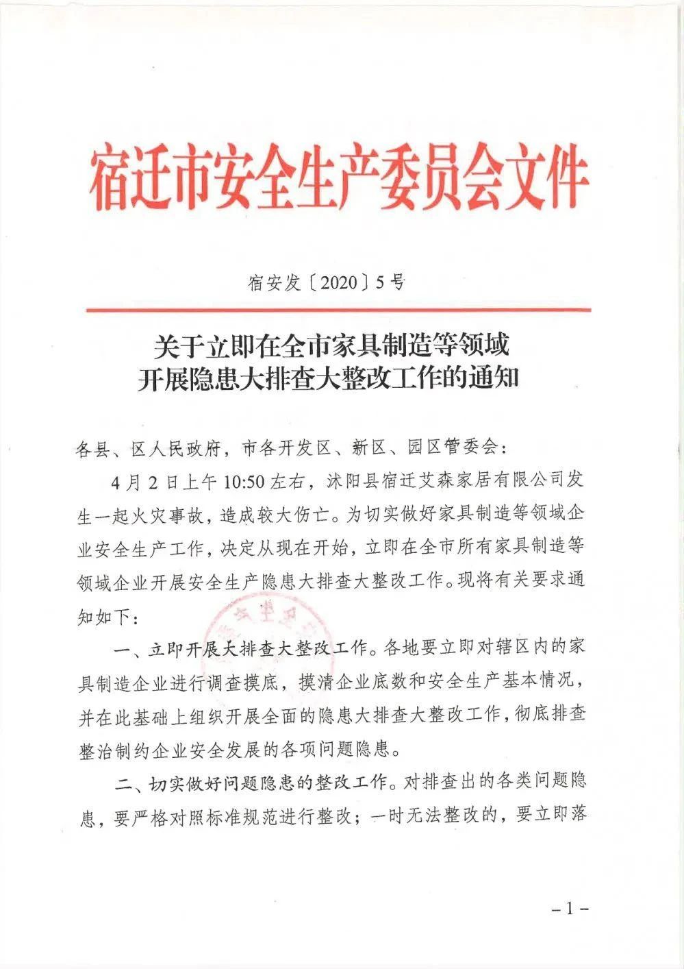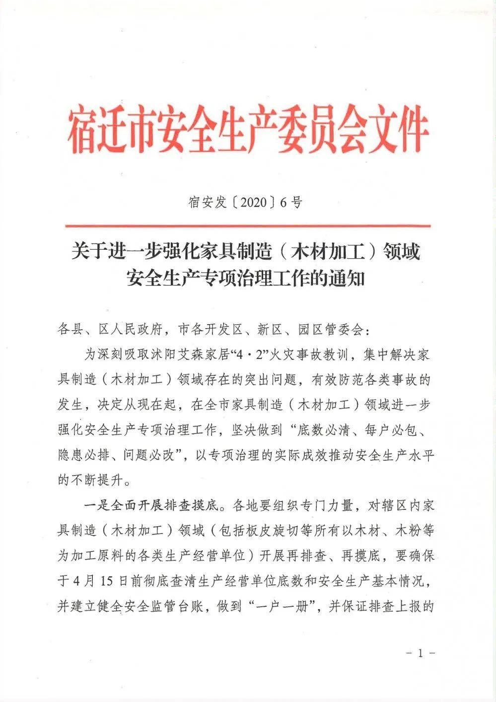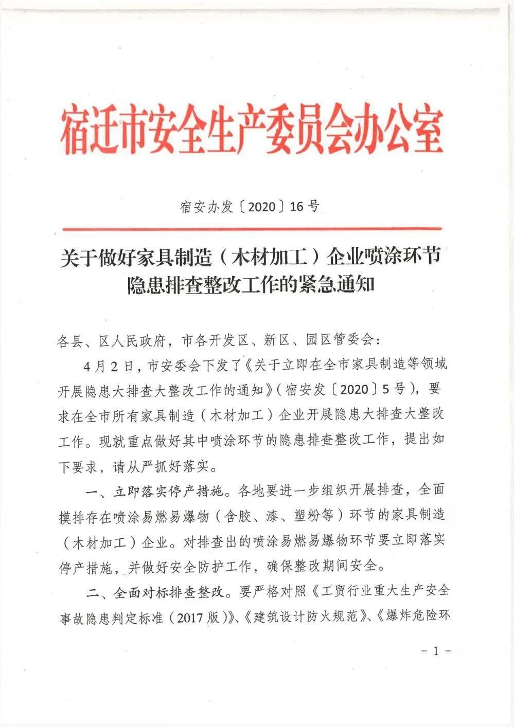 宿遷安監消息:近日,宿遷市安委會連續發出5號、6號文件,安委辦發出16號文件,要求開展專項治理。安委辦16號文件特別提出要重點做好家具制造噴涂環節的隱患排查整改工作。