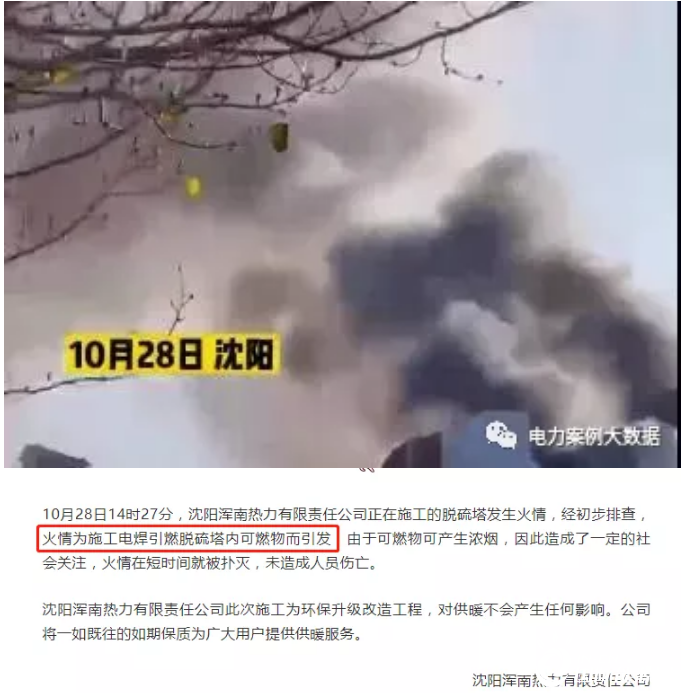 10月28日14時27分,沈陽渾南熱力有限責任公司正在施工的脫硫塔發生火情,經初步排查,火情為施工電焊引燃脫硫塔內可燃物而引發,由于可燃物可產生濃煙,因此造成了一定的社會關注,火情在短時間就被撲滅,未造成人員傷亡。