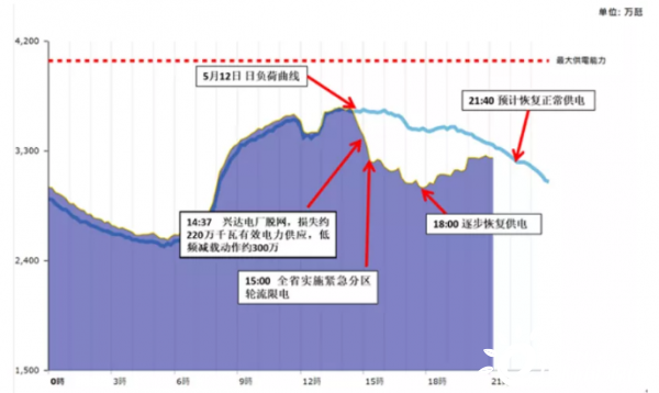 5月13日14時(shí)37分,興達(dá)電廠因接入345千伏路北變電站母線(xiàn)故障,導(dǎo)致電廠電力送出受阻,兩臺(tái)燃煤及兩臺(tái)燃?xì)鈾C(jī)組脫網(wǎng),系統(tǒng)損失有效電力供應(yīng)約220萬(wàn)千瓦,造成臺(tái)灣系統(tǒng)頻率驟降,為維持電網(wǎng)穩(wěn)定,電力系統(tǒng)在第一時(shí)間自動(dòng)啟動(dòng)低頻卸載約300萬(wàn)千瓦。臺(tái)電評(píng)估短時(shí)間內(nèi)無(wú)法立即復(fù)電,為維系電力系統(tǒng)安全,自下午3時(shí)起執(zhí)行緊急分區(qū)輪流停電,最大限電達(dá)到350萬(wàn)千瓦。事故過(guò)程系統(tǒng)負(fù)荷變化曲線(xiàn)下圖所示。