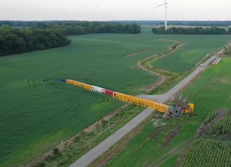 該風電場項目準備安裝 61 臺渦輪機,最大發(fā)電量為 219.6 兆瓦。該項目將覆蓋約 50,000 英畝土地。事故吊車屬于當?shù)匾患绎L能和太陽能公司,當時這輛800t履帶吊車正用于安裝風電機組,該風電機組通常位于雅芳北部和特里普西南部。當時疑似下方地面松軟,未進行吊裝前的勘察工作,負載過高造成大規(guī)模下陷,從而導致整車側(cè)翻。