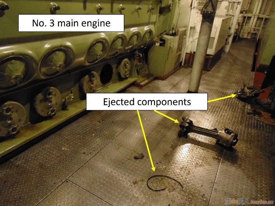 在煙霧開始消散,主機周邊降溫后,船員認為沒有必要使用消防水槍或二氧化碳消防系統。在“Wenatchee”號安全抵達泊位后,工程師再次進入機艙,并發現三號發動機旁邊散落的一些破損部件,包括連桿和一部分活塞。