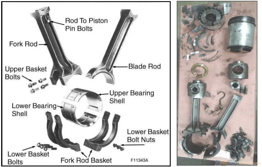 在檢查中,工程師發現6號曲柄銷(用于6號和14號氣缸)的連桿和活塞處于“完全損壞狀態”。在油底殼中發現曲柄總成托架的一個完整螺栓,同時在另外一處發現了緊固螺母,這證明螺栓和螺母是在運行過程中脫落的。總成的其他螺栓均由于拉伸過度而發生變形及斷裂。