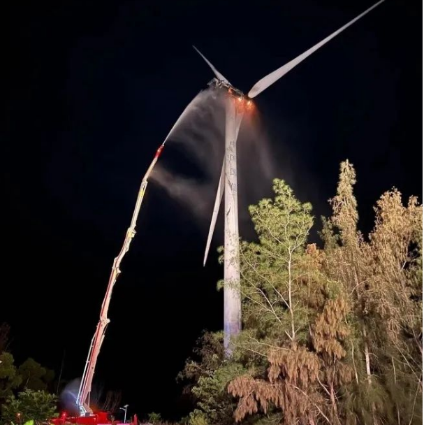23時許,消防救援人員到達現場。經偵查現場為海南東方高排風力發電有限公司的17號風機機艙著火,燃燒機艙墜落物導致地面樹林有多處雜草起火。了解現場情況后,指揮部立即做出戰斗部署:一是設立警戒立即疏散周邊圍觀人員防止高空墜落物傷人,并設置現場安全員,觀察現場救援環境;二是利用城市主戰車出槍撲救地面雜草火;三是利用62米舉高噴射車撲救發電機艙明火。