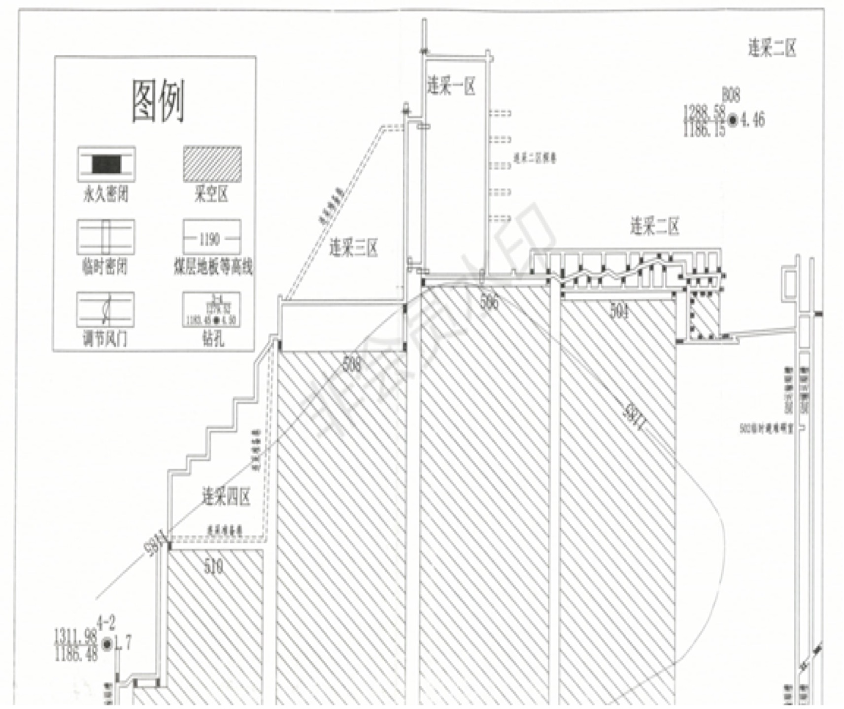 式回采。一區和二區的開采實為同一個工作面,在開采一區時,同步開采二區,即506連采工作面實為一區、二區合并而成。