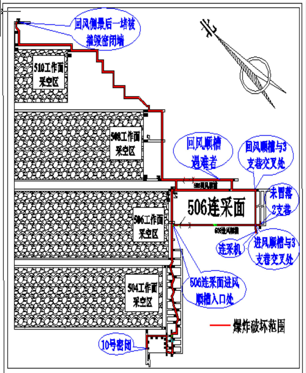 1. 爆炸沖擊波及全礦井,主要破壞范圍為506連采面和506連采面進、回風巷道(如圖3)。