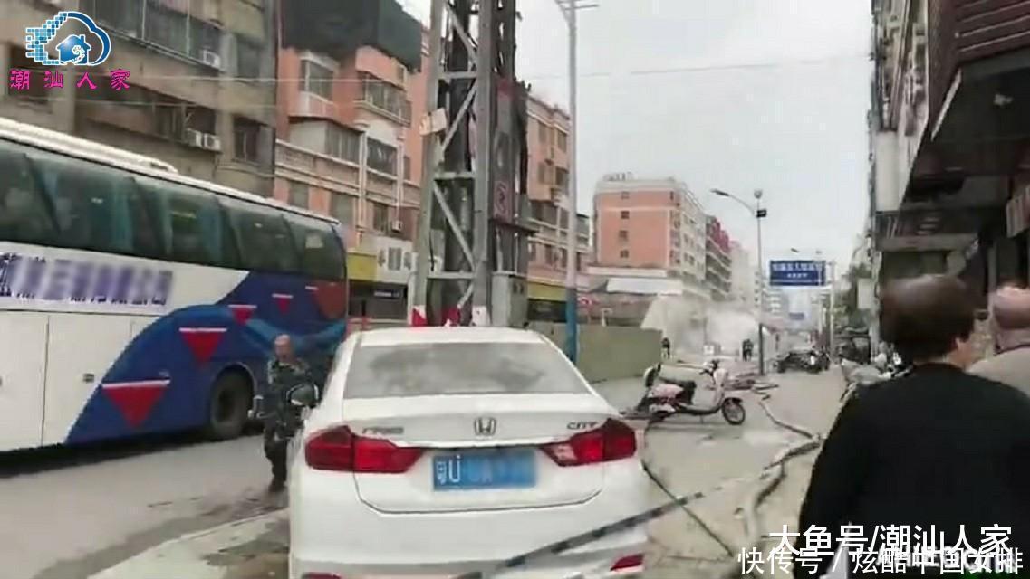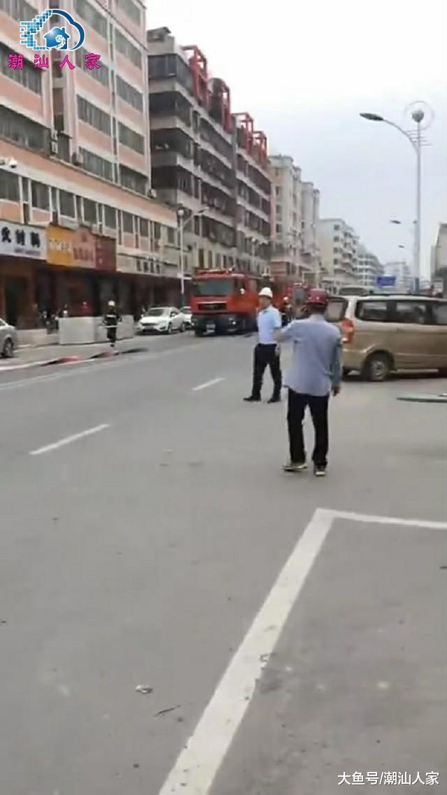 潮州發生一起天然氣管道泄漏事故, 現場拉起警戒線和疏散人群