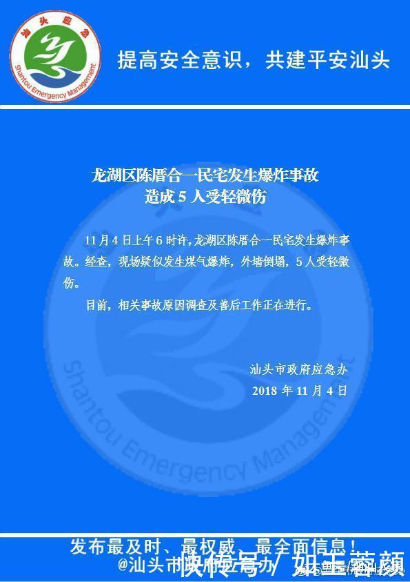 據“汕頭市政府應急辦”發布通報稱:2018年11月4日上午6時許,汕頭龍湖區陳厝合一民宅發生爆炸事故。經查,現場疑似發生煤氣爆炸,外墻倒塌,5人受輕微傷。目前,相關事故原因調查及善后工作正在進行。