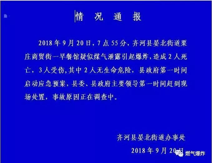 20日上午,10時左右,齊河縣晏北街道辦事處對外發布《情況通報》稱,2018年9月20日,齊河縣晏北街道栗莊商貿街一早餐館疑似煤氣泄漏引起爆炸,造成2人死亡,3人受傷,其中2人無生命危險,縣政府第一時間啟動應急預案,縣委、縣政府主要領導第一時間趕到現場處置,事故原因正在調查中。