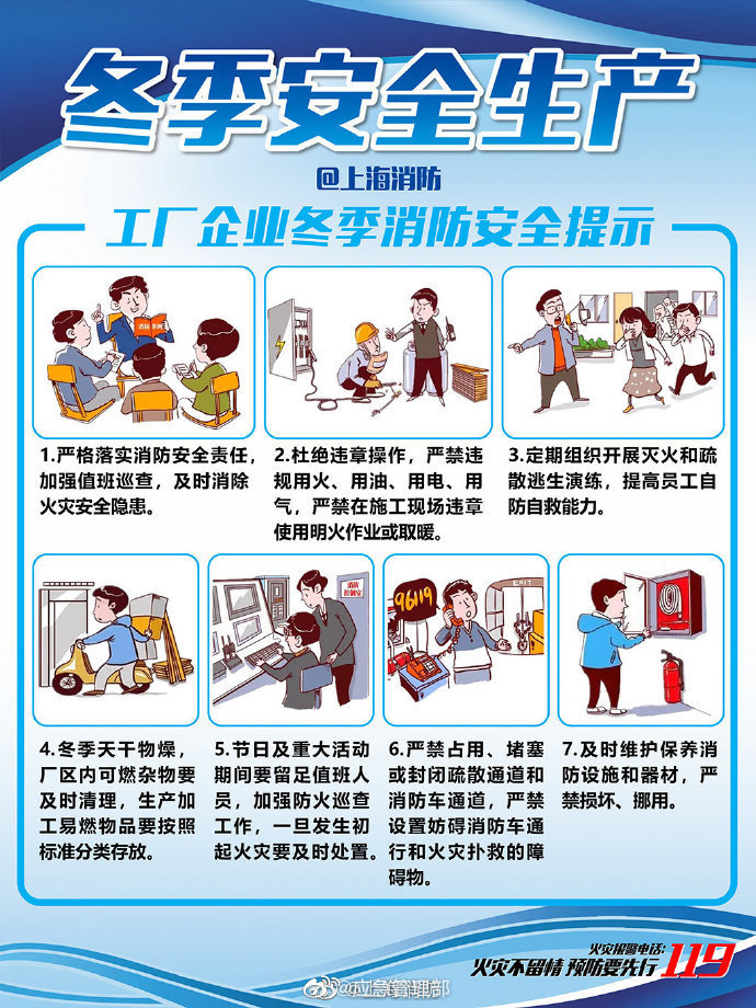 進入冬季,工廠企業安全生產至關重要,各個生產單位切記做好檢查工作,防患于未然。加強值班巡查、嚴禁在施工現場違章使用明火作業或取暖、定期組織開展滅火和疏散逃生演練……工廠企業冬季消防安全,這幾點要注意!